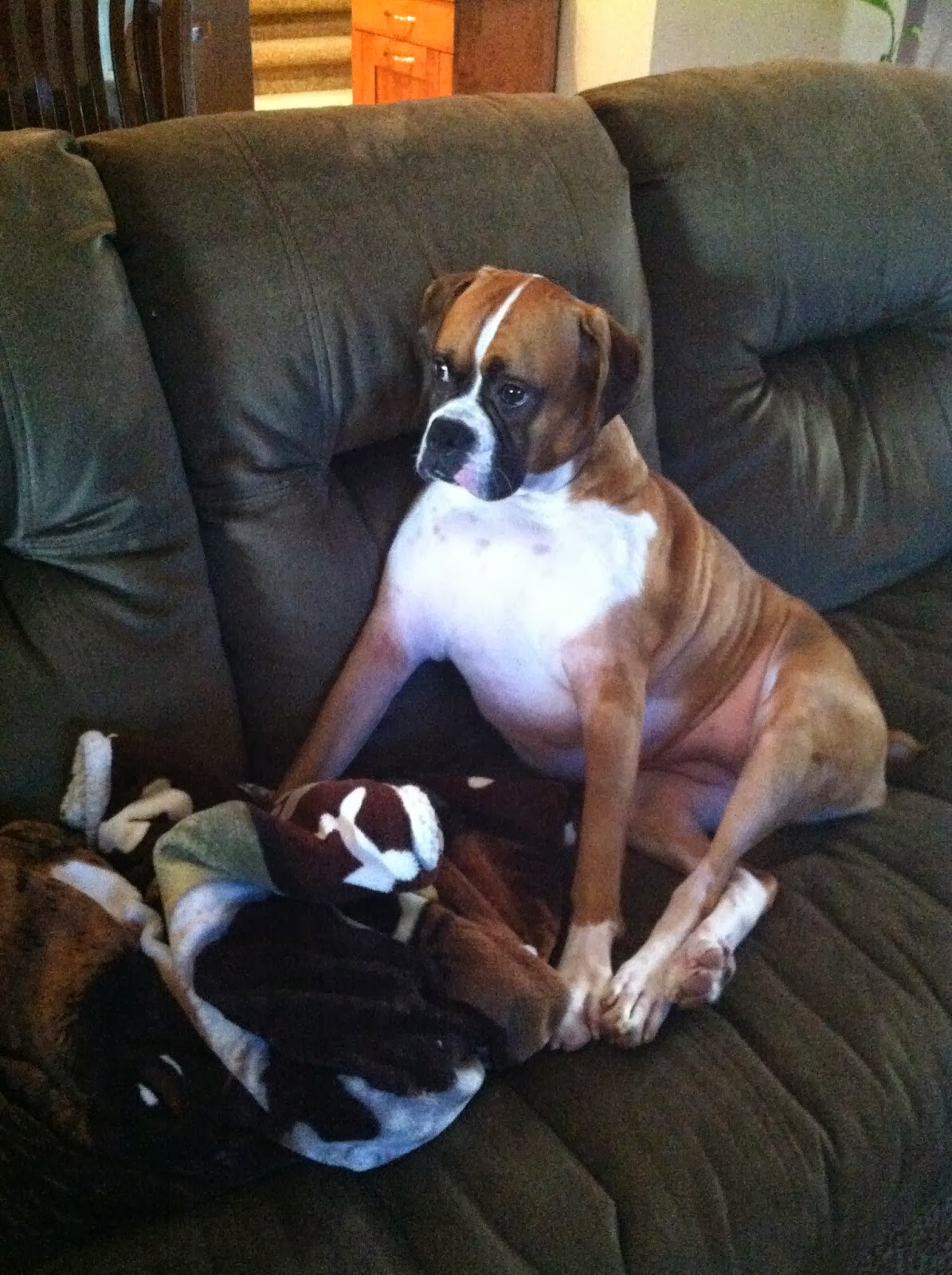 Duke is a total mama's boy (and I couldn't be happier!). This big guy's favorite past time is snuggling on top of his mama. And as always, he's never far from me when I'm home; if I'm taking clothes out of the dryer, Duke's right beside me, if I'm taking a shower, Duke's right outside of the shower door, and of course, if I'm in the kitchen, he's right under my feet (which can be very complicated!) I just love this big guy! Shh... don't tell anyone, but my 90 pound boxer boy, is a total teddy bear... with a bark that will scare even the meanest toughest UPS guy enough to send him quickly scooting back to his big brown truck!